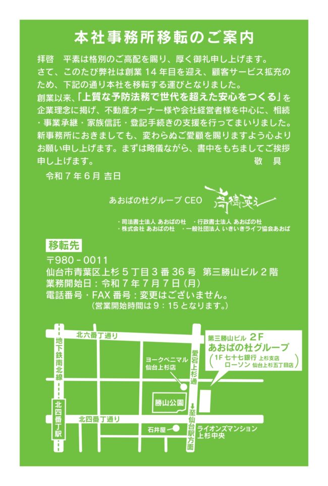 ■移転先住所:宮城県仙台市青葉区上杉5丁目3-36 第三勝山ビル2階
